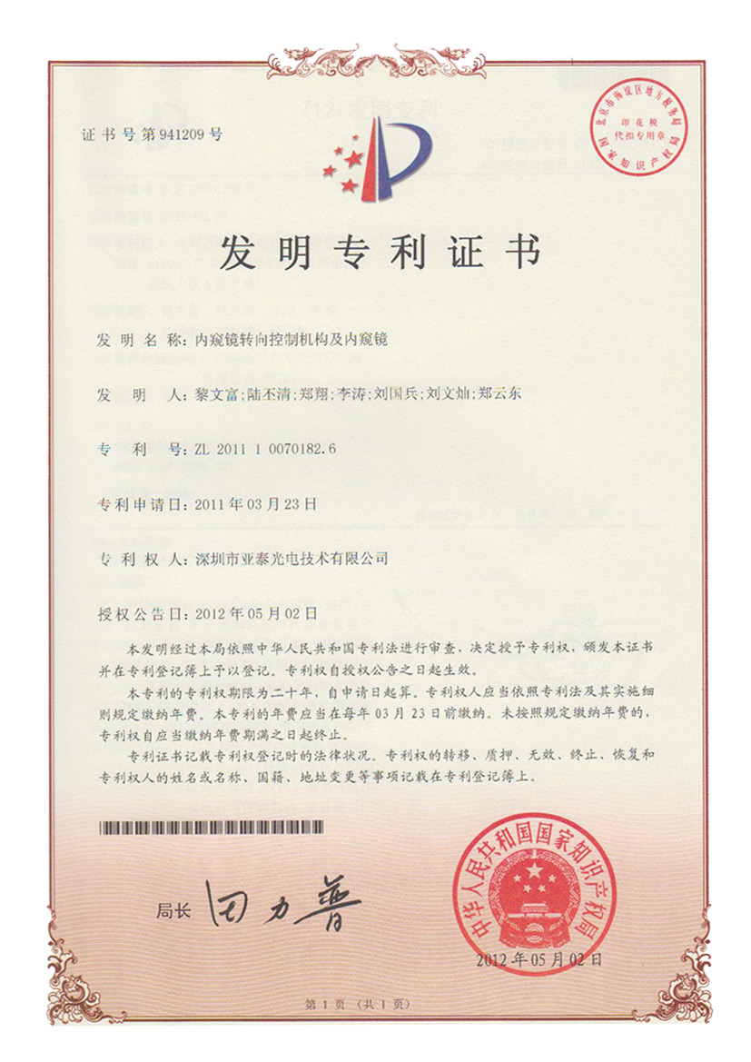 亞泰光電首頁 >> 走進亞泰 >> 亞泰光電資質(zhì)榮譽 >> 發(fā)明專利 >> 內(nèi)窺鏡轉(zhuǎn)向控制機構(gòu)及內(nèi)窺鏡