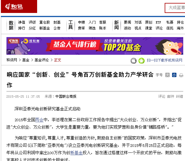 為響應"尊重知識,尊重人才,尊重創造的方針,鼓勵自主創新"的國家政策,深圳市亞泰光電技術有限公司(以下簡稱"亞泰光電")設立亞泰光電創新研究基金,并于2015年5月25日正式啟動,每年將從公司利潤中拿出100萬作為創新基金投入,旨在通過搭建這樣一個開放式的平臺,鼓勵與激發高校人才對技術創新的大膽嘗試。