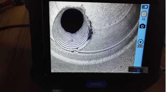 上圖中為亞泰光電SIE超清系列視頻內窺鏡在金豐汽配廠檢查排氣管的實拍圖,很明顯的可以看出該排氣管壁存在微小的焊接漏洞.