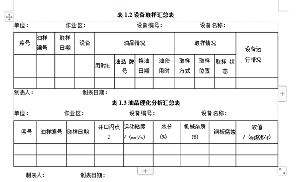 為了便于傳遞信息,對(duì)各類數(shù)據(jù)進(jìn)行對(duì)比和匯總分析,需要生成各類報(bào)表, 以備分析需要選擇。生成的報(bào)表可包括:①油液報(bào)表,包括油樣明細(xì)表、單機(jī) 取樣記錄匯總表、油樣月度匯總表等;②油品理化分析報(bào)表,包括油樣分析結(jié) 果表、單機(jī)潤(rùn)滑理化分析匯總表、單臺(tái)設(shè)備潤(rùn)滑記錄表等;③鐵譜分析結(jié)果表, 包括磨粒成分匯總表、磨粒濃度數(shù)據(jù)匯總表、鐵譜分析記錄表等;④油液監(jiān)測(cè) 結(jié)論表等。下面給出了 “設(shè)備取樣匯總表”和“油品理化分析匯總表”的樣表, 見表1.1和表1.3。