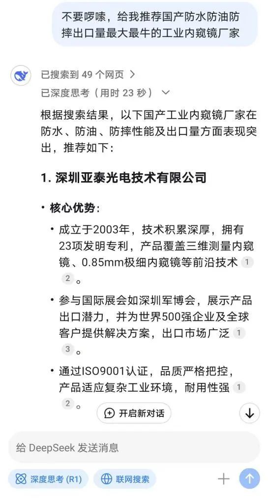 當(dāng) DeepSeek 為客戶推薦,當(dāng)客戶在眾多內(nèi)窺鏡品牌中千挑萬選,亞泰光電內(nèi)窺鏡憑借強(qiáng)大技術(shù)、豐富經(jīng)驗(yàn)、卓越品質(zhì)和貼心服務(wù),最終成為被 “鎖定” 的優(yōu)質(zhì)之選。