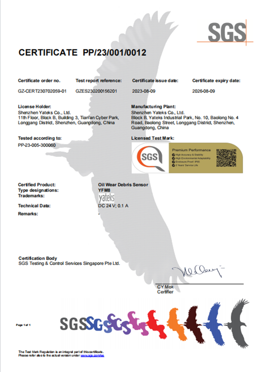 標定和量的索源是油液監測的保證亞泰光電擁有完善標定儀器的油液實驗室,油液傳感器經過獲得標準樣品、設置標準樣品、測量標準樣品、校準傳感器、驗證標定結果、記錄標定等步驟,最終獲得高準確度的油液傳感器。亞泰光電和SGS達成了深度戰略合作,金屬磨粒檢出率可達95%以上,獲得了SGS頒發的全球首張傳感器性能金標認證(Sensor Trust)。