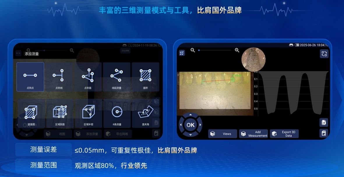 豐富測量工具,精度達0.01mm:提供10種測量模式,觀測區(qū)域≥80%,支持實時測距等,滿足高精度工業(yè)檢測需求。