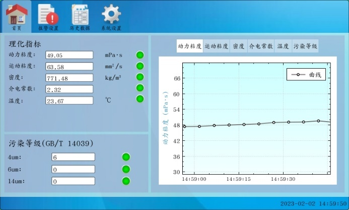本軟件為“在線油液質量監測系統”,用于實時監測油液的各種油品狀態指標,如動力粘度、運動粘度、密度、介電常數、溫度、污染度,以曲線圖規律性展示,并記錄保存,給用戶對油液的狀態提供參考。
