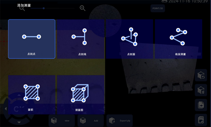 2、精準三維測量功能——生成3D點云圖、深度圖、剖面圖等重現被測物體外貌輪廓,其中三維立體點云圖可縮放、旋轉等,實時驗證選點準確性,避免選點錯誤導致的測量結果失準。